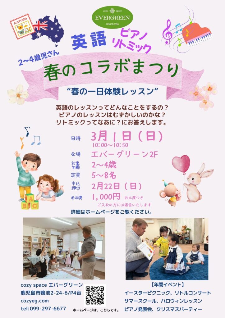 人気の「英語&リトミック」コラボレッスンを3月1日(日)に開催します。内容は、英語と音楽を楽しくコラボさせた内容で、英語絵本の読み聞かせ、ゲームを通しての英会話、音楽あそび、ピアノの鑑賞、楽器でアンサンブル、など盛りだくさん。今回は、何と… -
