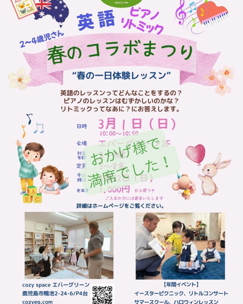 おかげ様で「春の英語&音楽リトミックコラボまつり」を無事に終了することができました。 子どもたちは、すぐにお教室にも先生にもなじんでくれて心ゆくまで英語と音楽を楽しんでくれました。 みんなで作ったマラカスも気に入ってもらえてよかったです… -