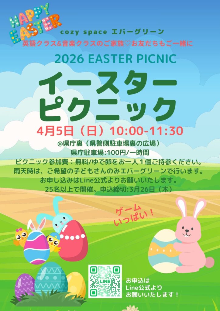 イースターがやってきますね!エバーグリーンでは、今年も人気の「イースターピクニック」を開催いたします!春の青空の下、親子、お友だちみんなで一緒に遊びましょう!絵を描いて色付けしたたまごを一番最初に見つけるのは誰かな?お申込みは、Line公式… -